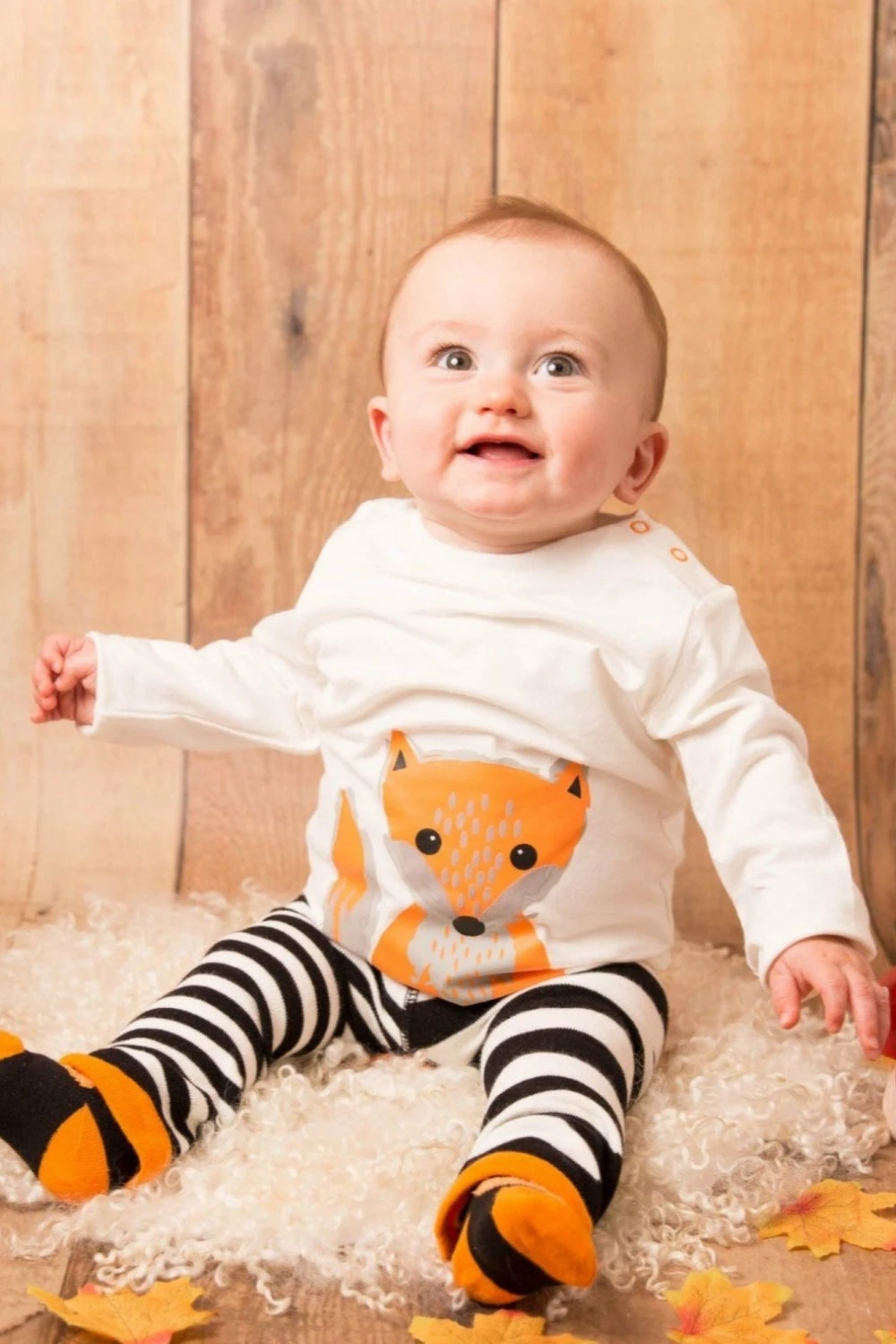 Stand out in these black and vanilla ice striped leggings with our fabulous Fox on the bum. Fantastic for nature lovers, the monochrome stripe and contrasting orange make this one funky Fox. The Fox is so popular we now have a full range so you can dress your kid head to toe in the design, come sun or rain.