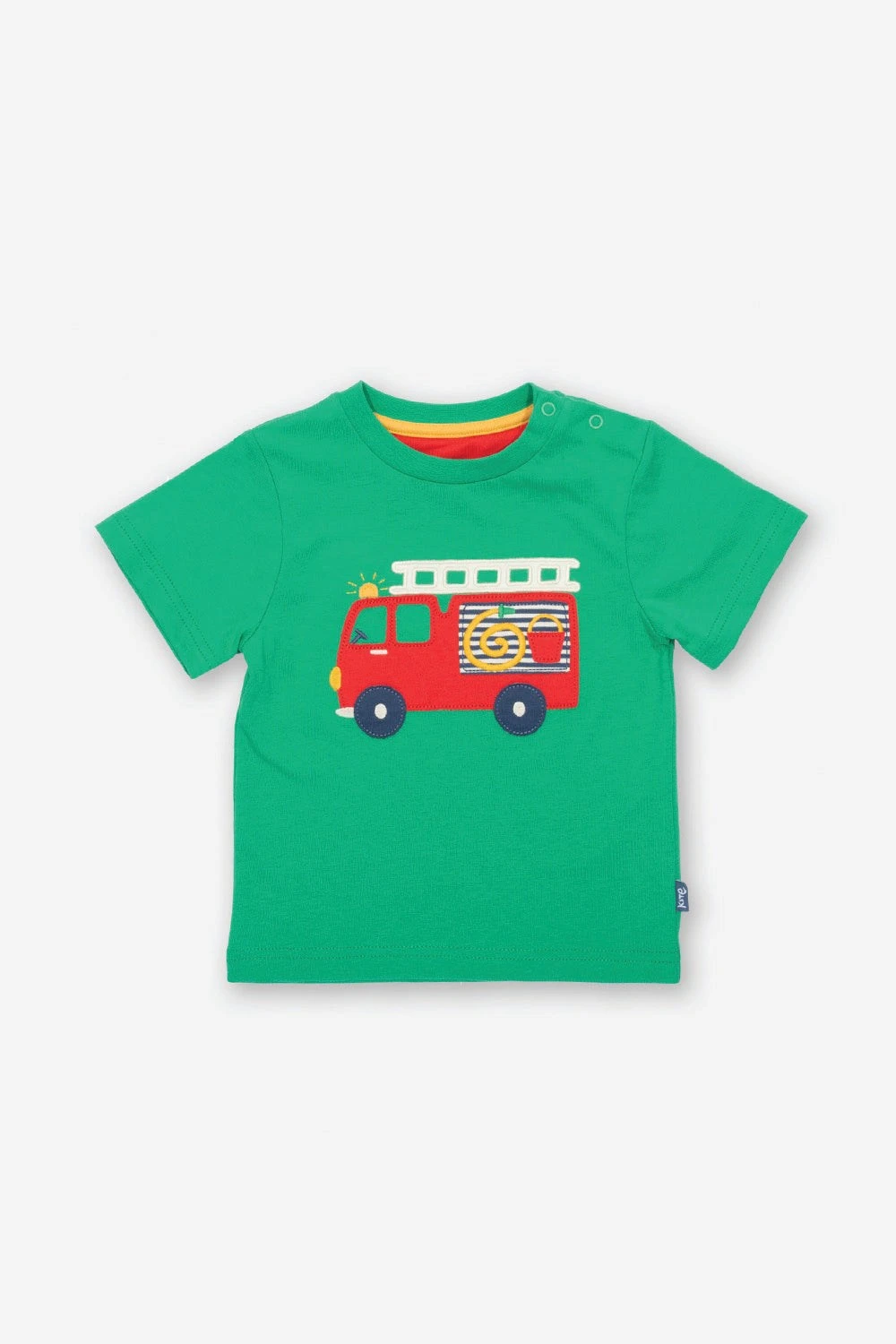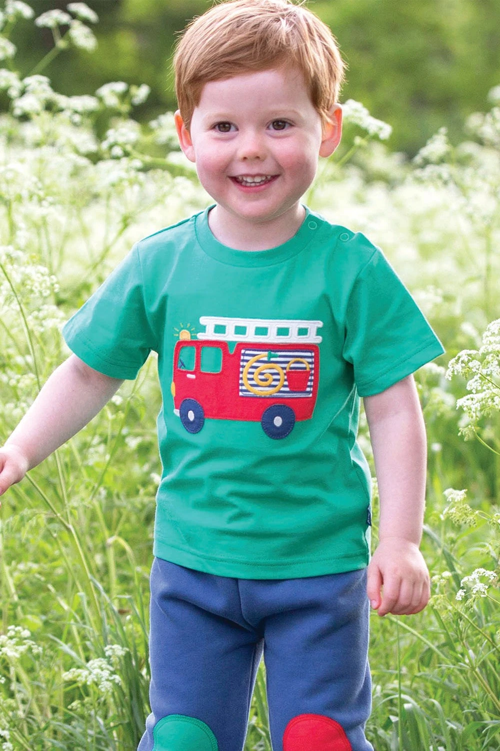 This fab fire engine t-shirt is go go go, perfect for active little ones. Made in a peacock green soft jersey fabric, starring a lovely fire engine appliquΓ© and popper shoulder opening. Pair with joggers or leggings for perfect playdate attire.
