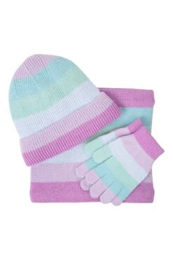 Our Amore Kids Winter Accessories Set is made up of a beanie, a snood and a pair of gloves. They are made of soft knitted fabric with a great striped design. This set adds a splash of colour to any outfit and would be perfect for gifting.