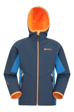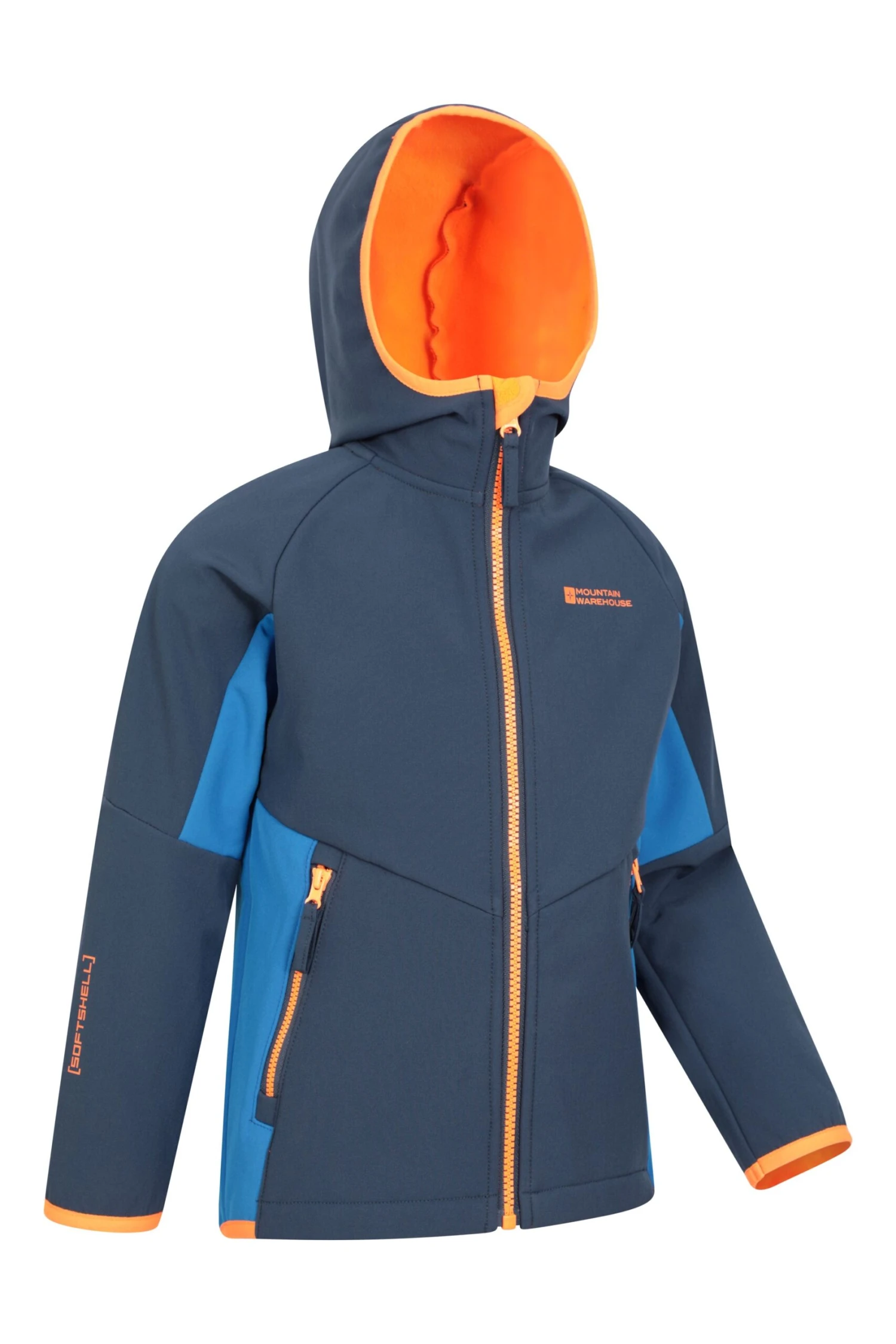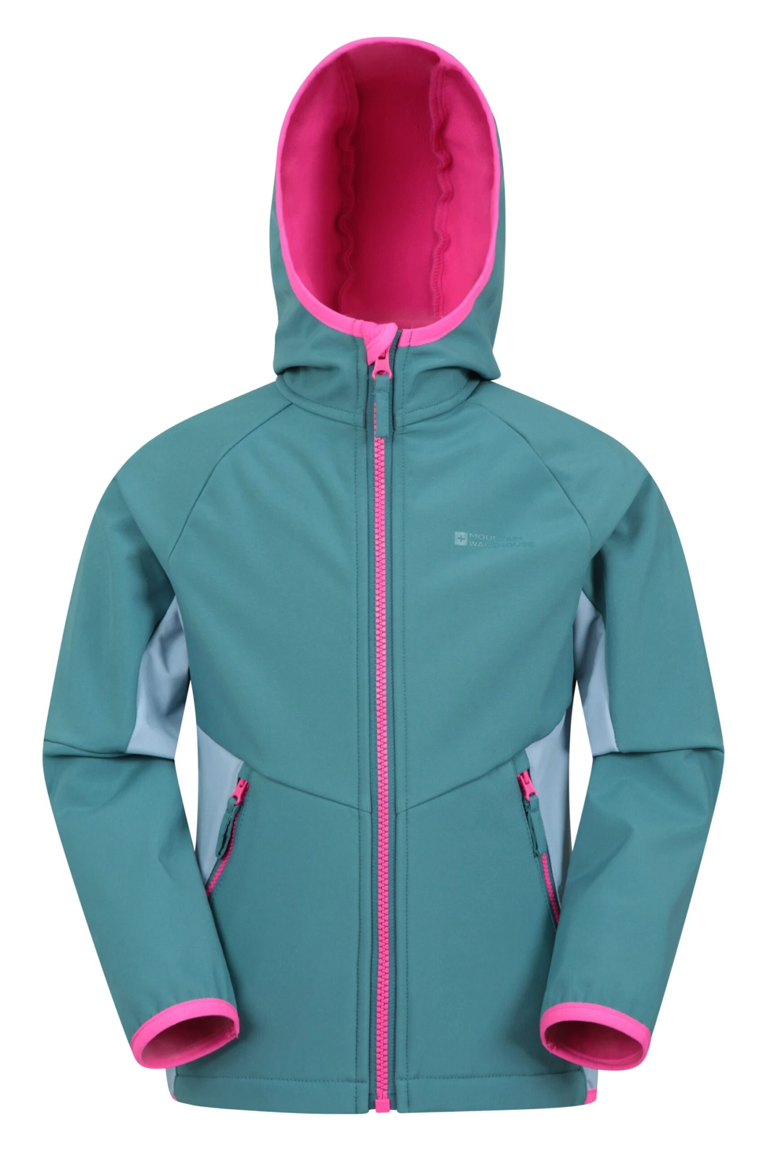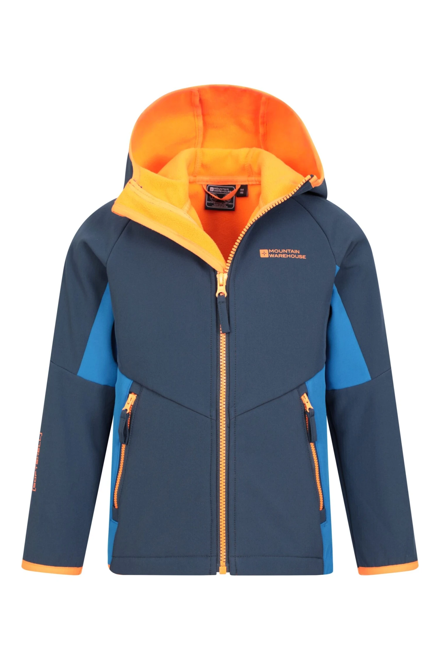 Our Kids Panelled Water Resistant Softshell is made of water resistant polyester fabric. It has two front pockets to carry all of the essentials and a hood to keep your little one dry if the weather changes.