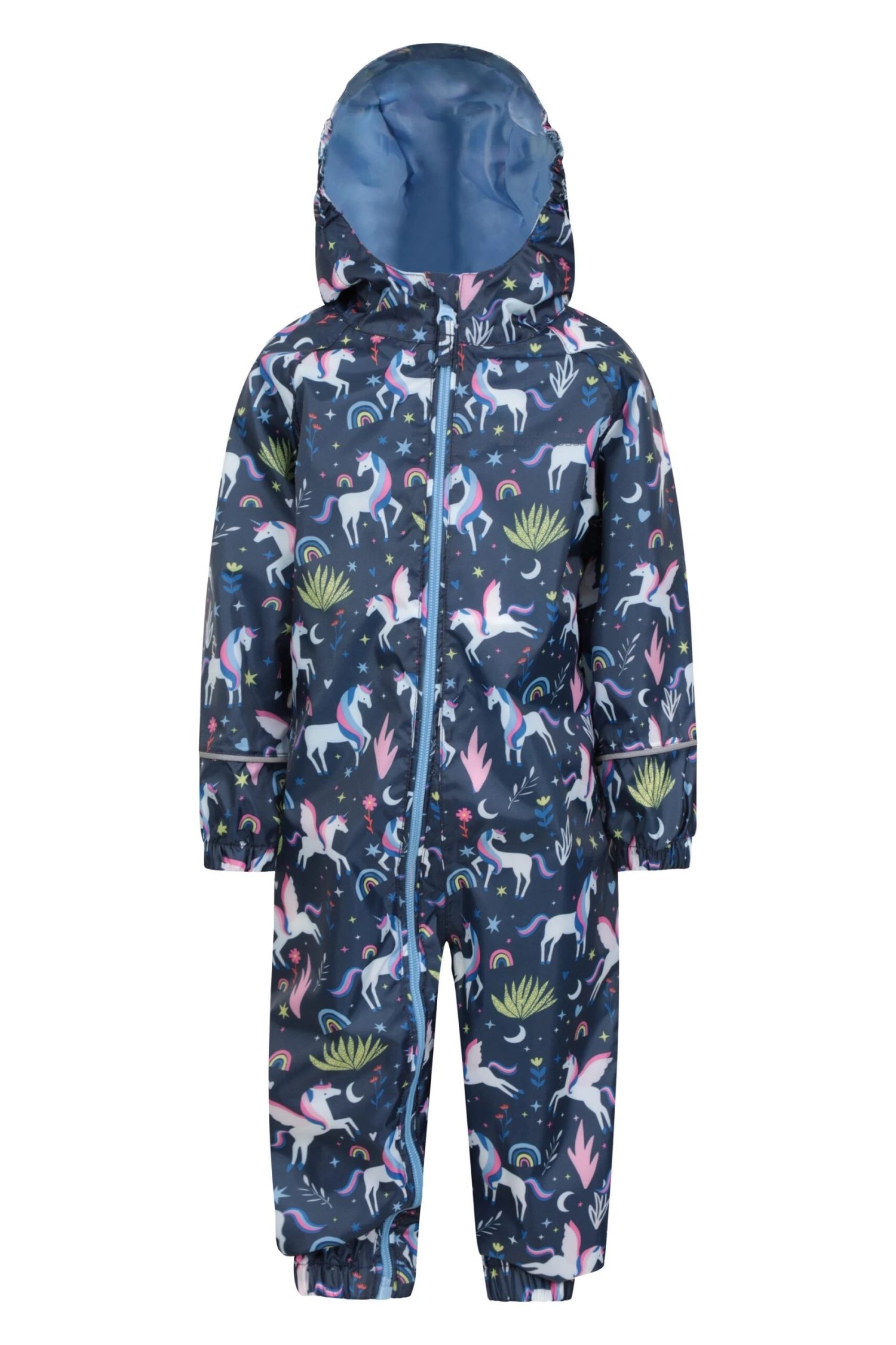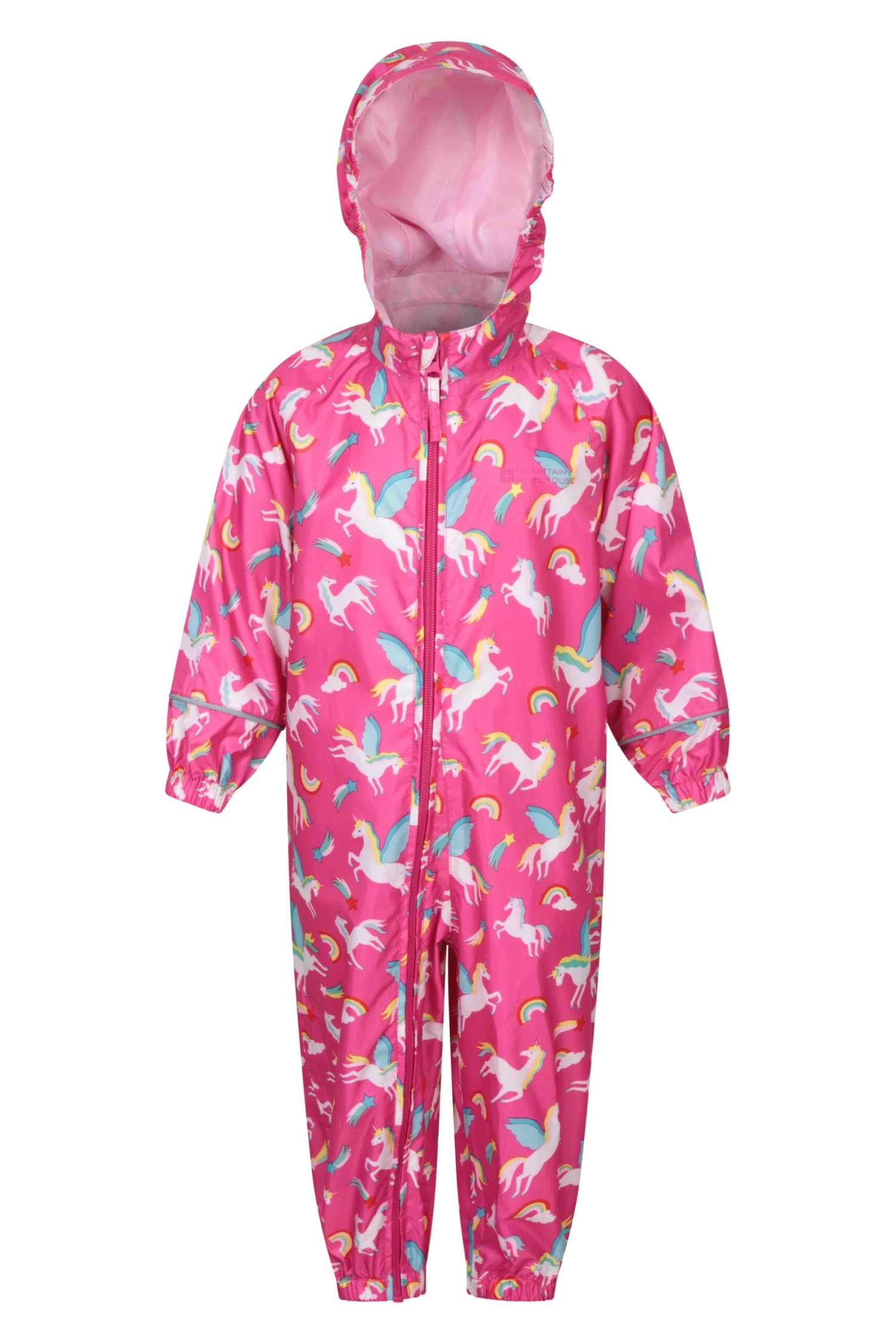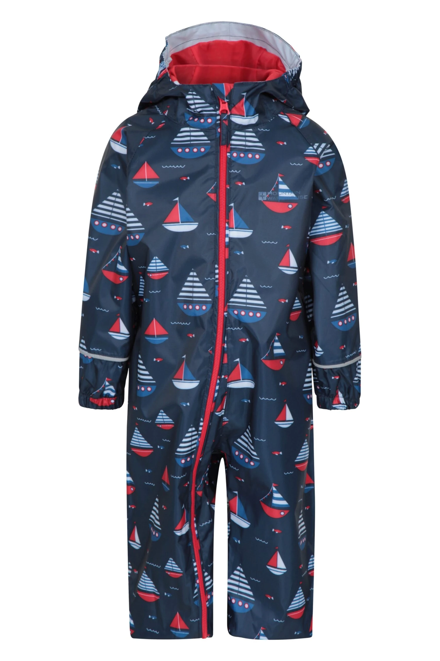 The Puddle Waterproof Rain Suit is an all-in-one for toddlers with a full diagonal zip. Comes in a bright print with reflective piping, elasticated cuffs and hood – it is ideal for rainy days out and about town.